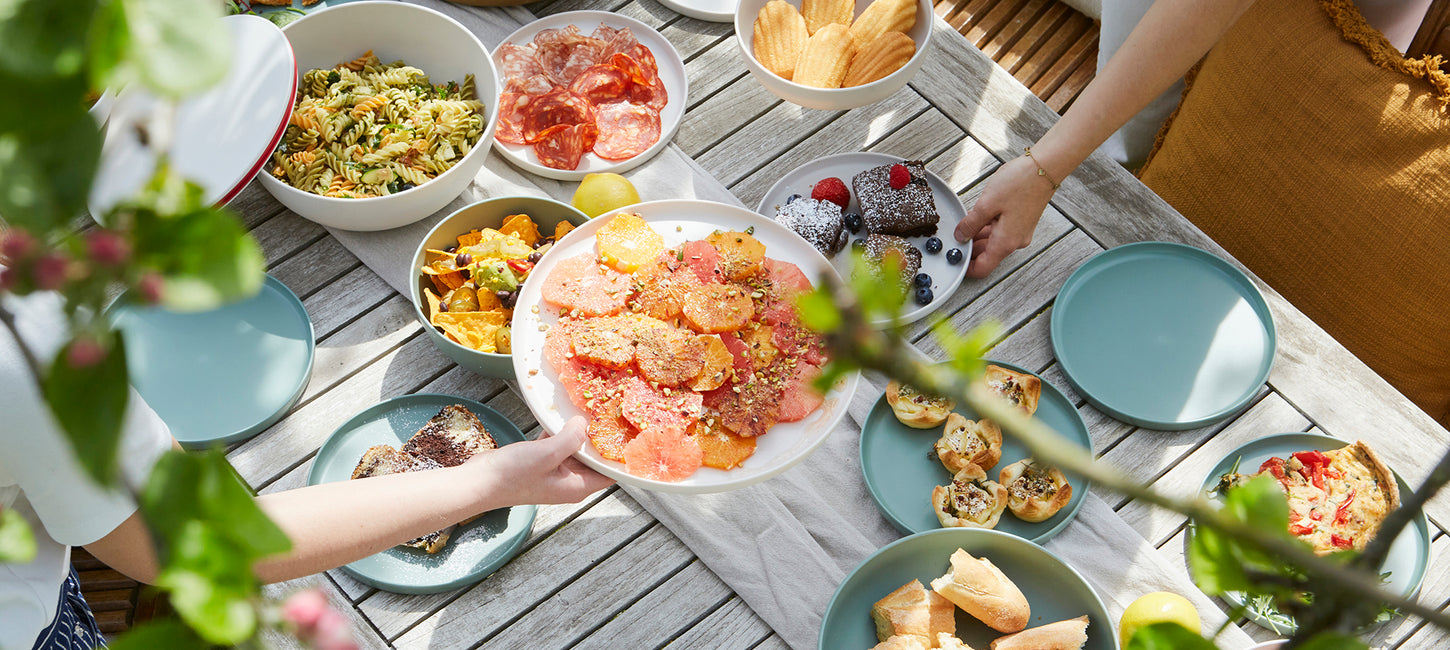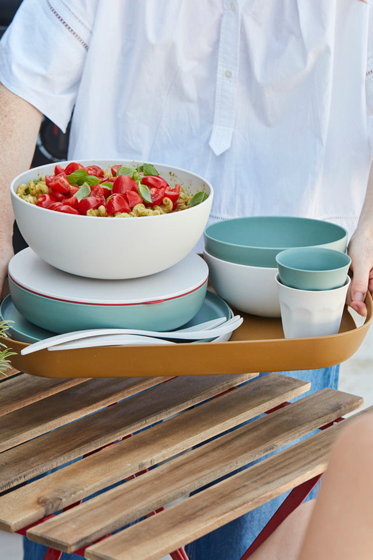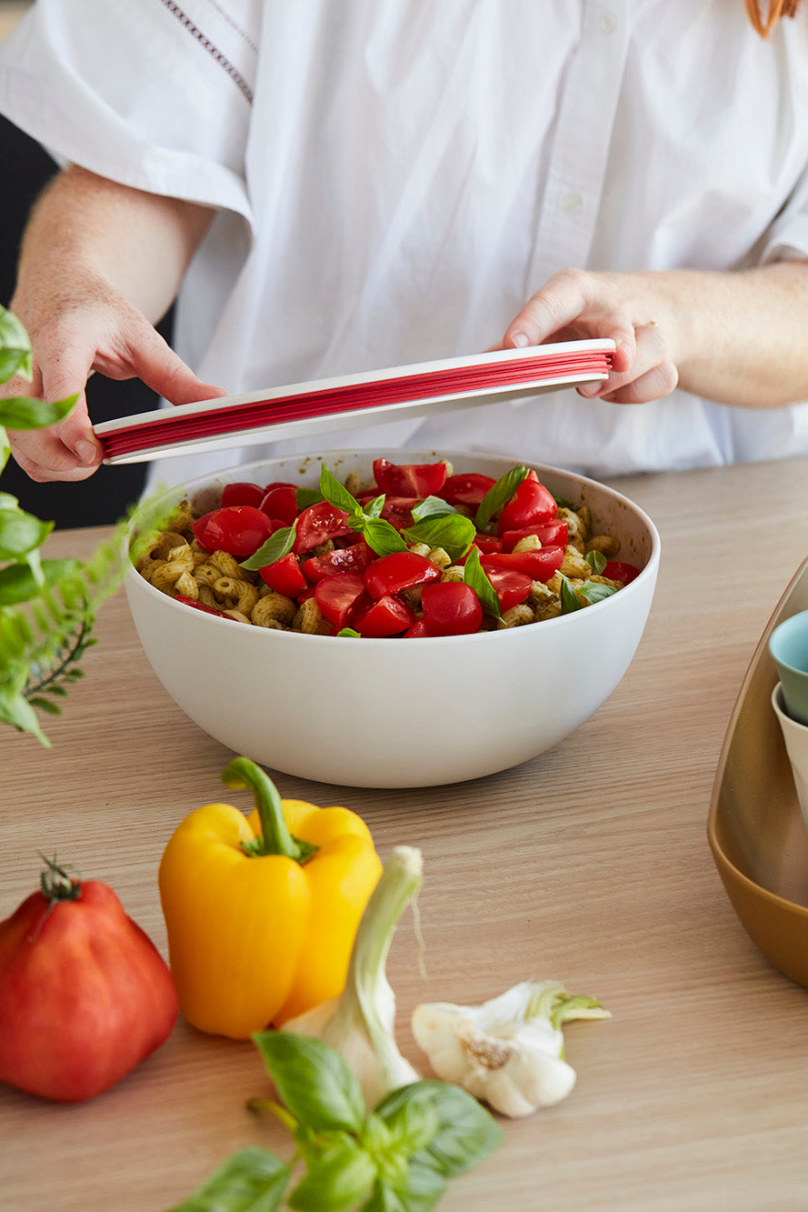 Fresh pasta pesto with cherry tomatoes and basil, perfect for picnics! Prepare, mix, and serve sustainably with Point-Virgule’s rPET collection:...