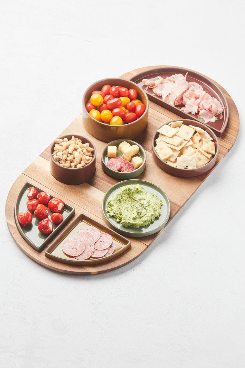 Thanks to the built-in magnets, the round acacia boards click seamlessly together, creating an XXL surface perfect for grand moments or cozy gatherings. The magnets allow you to mix and match different boards, experimenting with combinations to design unique layouts that suit your style. They provide a practical, stable surface while letting you create striking arrangements that will impress your guests. The warm shades of sage green, vintage maroon, and cumin perfectly complement the natural character of FSC®-certified acacia wood. Perfect for entertaining, serving, and showcasing your favorite treats with flair.
