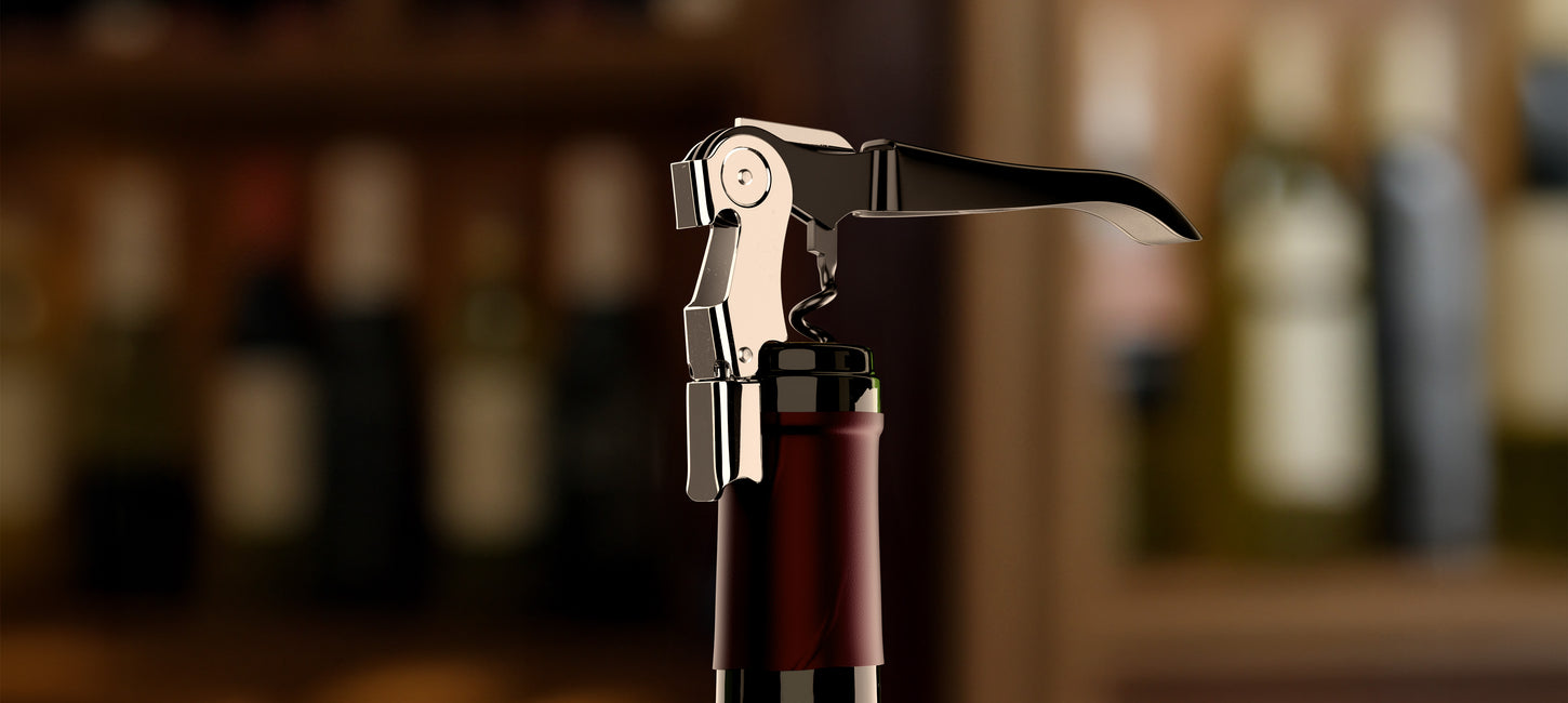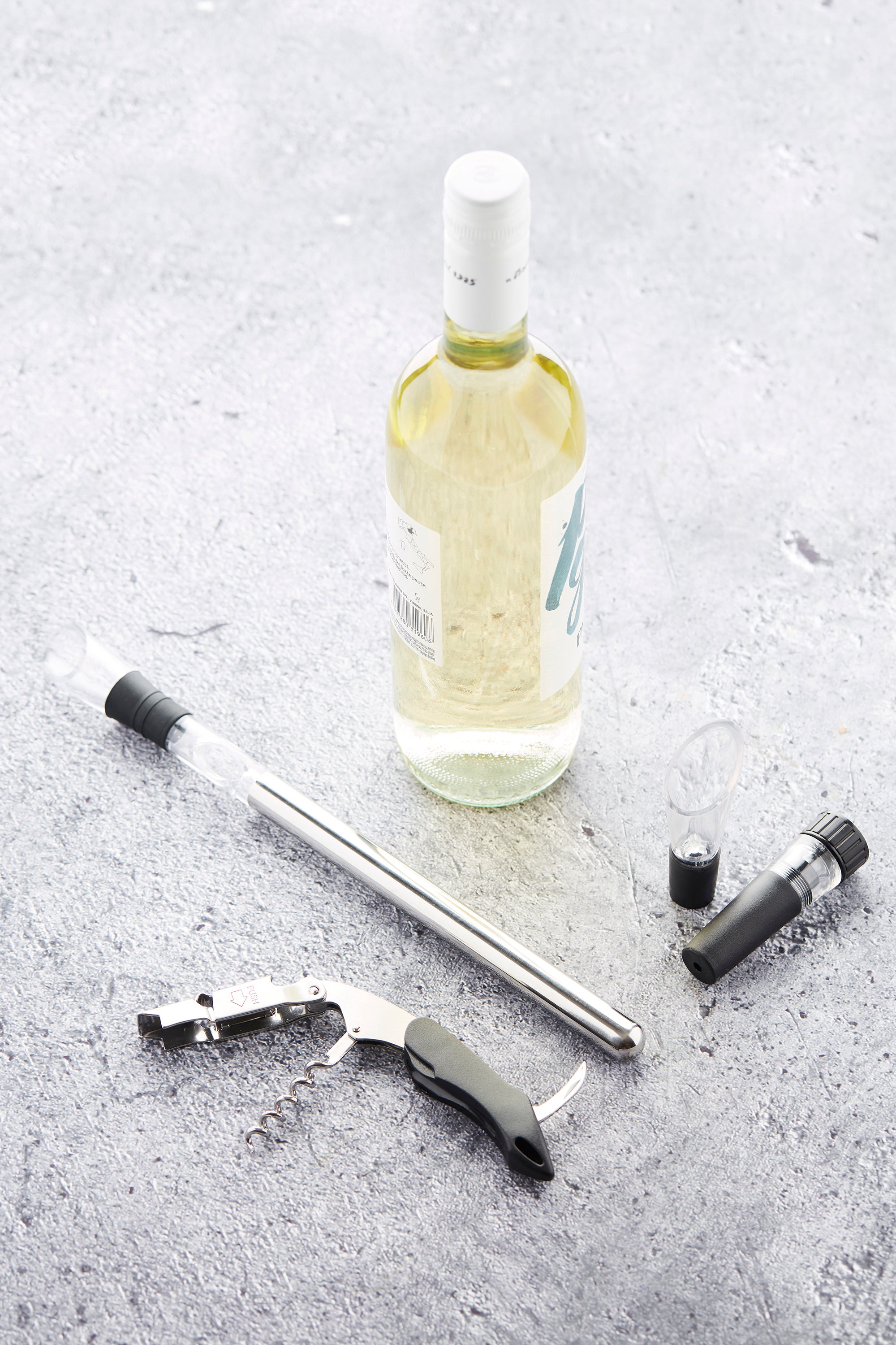 - 4-piece set: waiter's corkscrew, wine cooling stick, pourer, and vacuum stopper