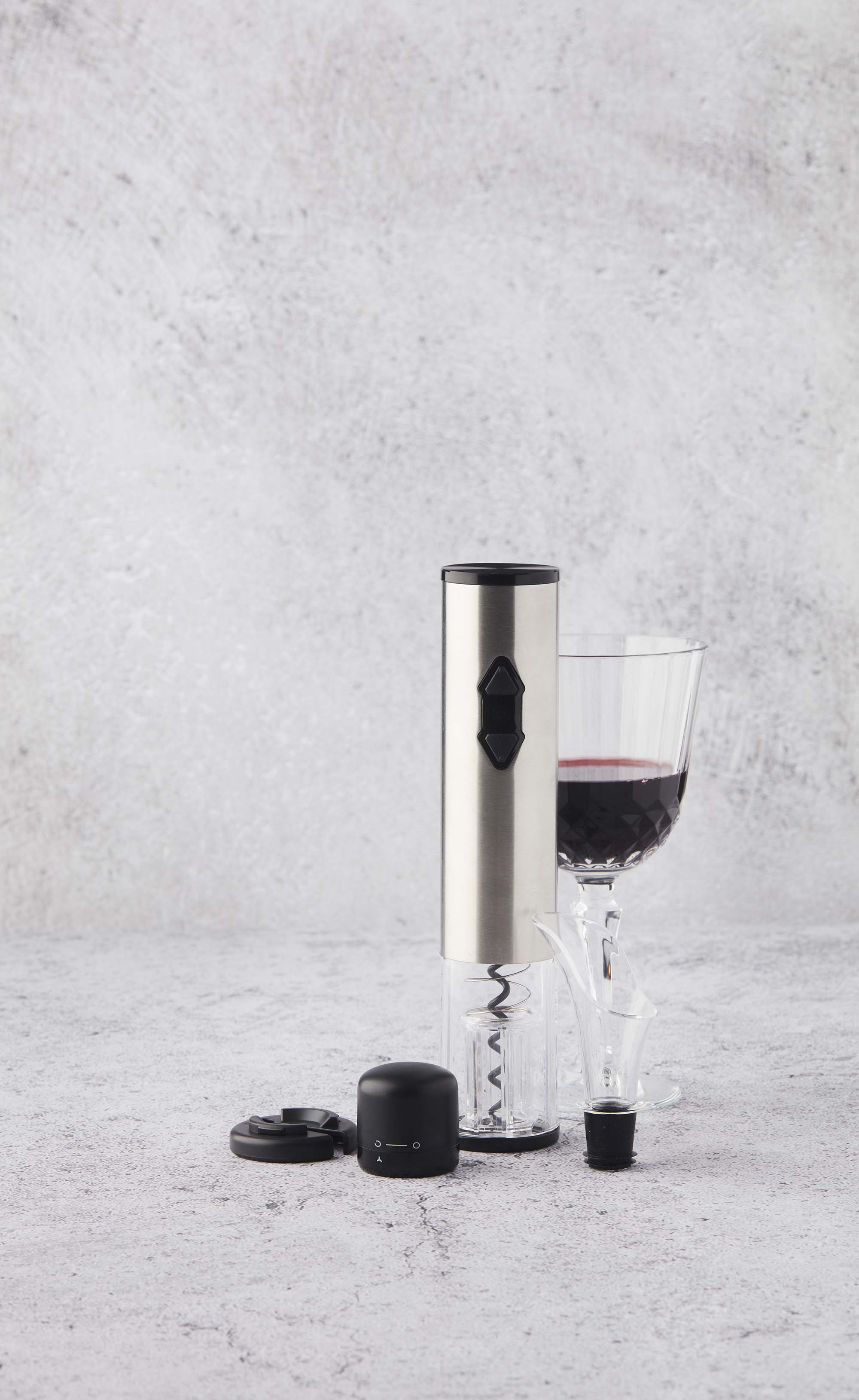 - 4-piece set: electric corkscrew, pourer, vacuum stopper, foil cutter